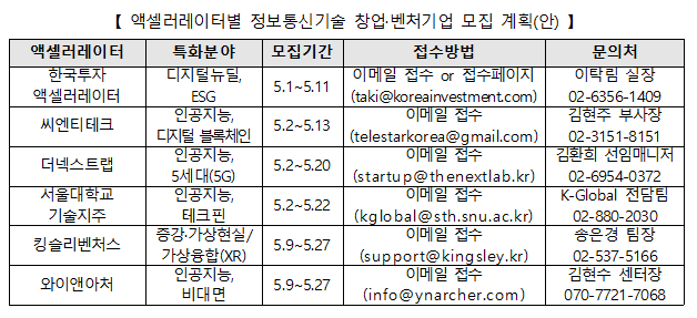 이번에 선정된 6개 액셀러레이터는 ▲한국투자액셀러레이터, ▲씨엔티테크, ▲더넥스트랩, ▲서울대학교 기술지주, ▲킹슬리벤처스, ▲와이앤아처이며, 액셀러레이터별로 각각 8개 내외의 창업·벤처 기업을 모집·지원할 계획이다.