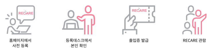 홈페이지 사전등록 → 등록데스크 본인 확인 → 출입증 발급 → RECARE관람