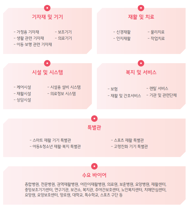 △기자재 및 기기 △재활 및 치료 △시설 및 시스템 △복지 및 서비스 관련 품목이 전시되며, 재활·복지 산업의 발전을 위한 다양한 주제의 콘퍼런스도 함께 개최된다.