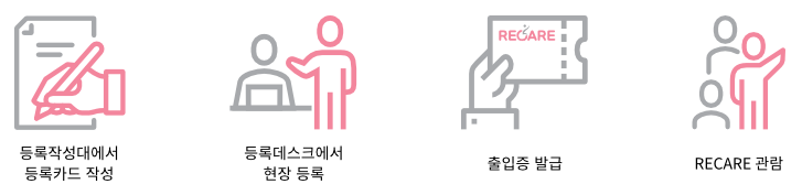 등록 작성대 등록카드 작성 → 등록데스크 현장등록 → 출입증 발급 → RECARE관람