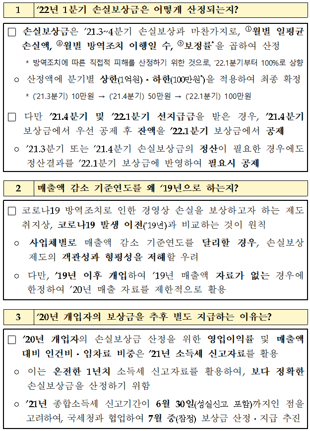 ➊2020년 개업한 사업체는 보상금 산정에 활용되는 2021년 종합소득세 신고 기간이 6월 30일(성실신고 포함)까지인바, 국세청과 협업하여 관련 자료가 준비되는 대로 7월 중(잠정) 보상금을 산정․지급할 계획이다.