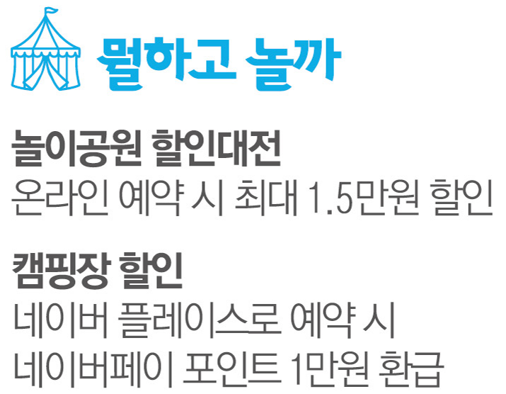 이 밖에 유원시설과 캠핑장 이용요금 할인, 여행업계와 여행 가는 달 참여기관의 자체 할인행사 등 다양한 할인 혜택이 준비되어 있다. 다만 모든 할인 혜택은 준비된 예산이 소진되면 종료될 예정이다.