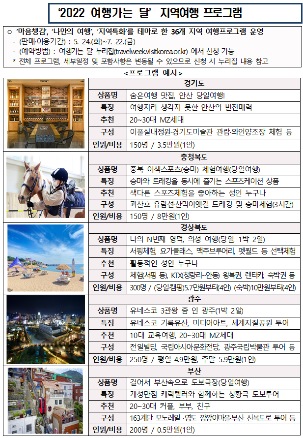 한국관광공사와 함께 코로나 사회적 거리두기 해제 이후 단계적 일상 회복에 따라 높아지고 있는 국민들의 여행 수요에 부응하기 위해 6월 2일(목)부터 30일(목)까지 ‘2022 여행 가는 달’ 캠페인을 문화체육관광부(문체부)가 추진한다.