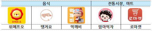온라인쇼핑몰 ‘11번가’ 내 소상공인 전용관 ‘e서울사랑샵#’과 ‘제로배달 유니온’에 참여한 배달앱 5개(①위메프오 ②땡겨요 ③먹깨비 ④맘마먹자 ⑤로마켓)다.